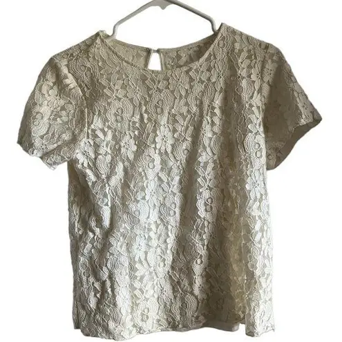 . Back keyhole button closure. Sheer cream lace overlay. White tank attached underneath. The ma... Show more