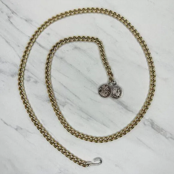 Brand: Unbranded 📏 Size: One Size 🤍 Color: Gold Tone 👗 Style: Chain Belt This gorgeous chain belt is giving major Y2K vibes! Features gold tone chain links with the cutest coin charms. Perfect for cinching oversized pieces or adding edge to any outfit! Details: - One Size - Largest adjustment 40.75 inches x 0.32 inch width - Lightweight 1.5 oz - Gold tone metal construction - Decorative coin charms Condition: Shows hardware finish wear and scuffs from previous use but still looks amazing and functions perfectly. Style over a flowy dress, with high-waisted jeans, or layer it for that perfect Y2K moment! ✨ B6368