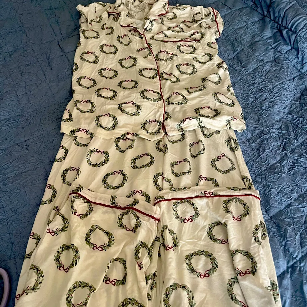 Cozy pajama set with a festive wreath print. Features a cream base with red accents. These pajamas are super soft and perfect for the upcoming holiday season. Women’s size small