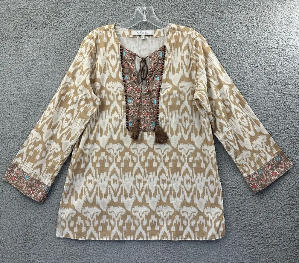 Bella Tu Long Sleeve Tunic Top V Neck Beige Cotton Beaded Sequin Boho Women's L Pullover V neck with tassel tie Beaded and sequin front Sequin detail on sleeve ends Side slits 100% cotton See photos for measurements Condition: Preowned. Gently used with minimal wear. 22-1212