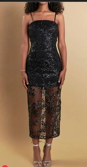 Uniquely designed for a night out this gorgeous sequin embroidered Maxi Cocktail Dress is a showstopper. Crafted with perfection that features a fitted silhouette straight neckline and side zip closure. With light-catching sequins and classic maxi length, this dress will make you feel like a fashionista. Show off your curves and have all eyes on you with this beautiful sequin embellished dress. Get ready to sparkle and steal the spotlight. Sequins embroidered Maxi length Fitted Straight neckline Adjustable spaghetti straps Side zipper Lining Hand wash cold Do not bleach Do not tumble dry Do not iron Shell: 100% Polyester Contrast: 100% Polyester Lining: 100% Polyester Stunning black dress with intricate sequin detailing. Features a sheer lower skirt for added elegance.