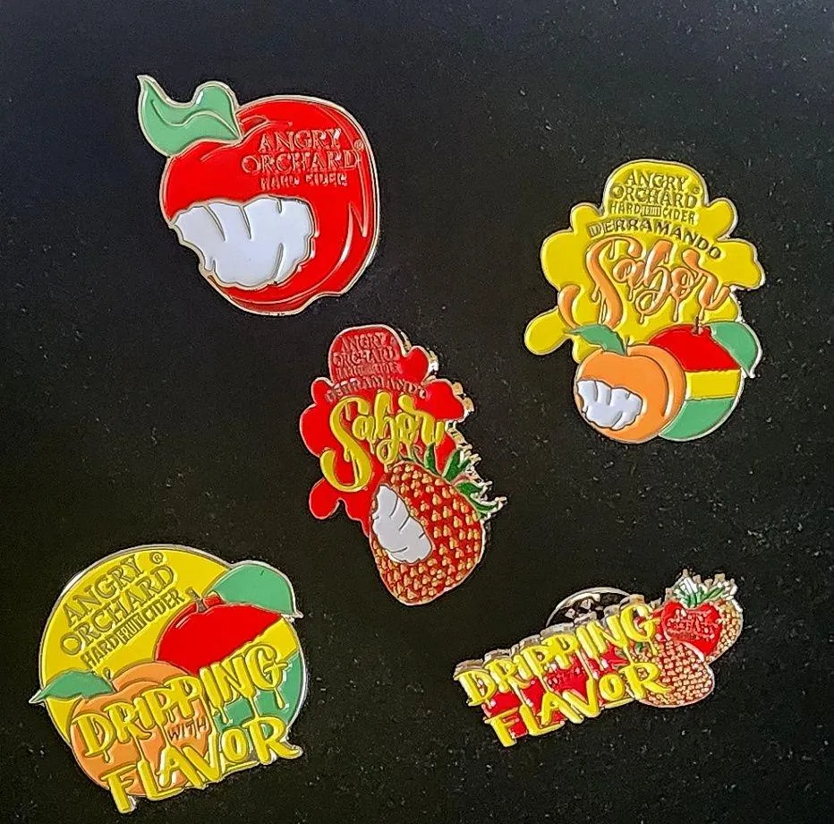 Set of 5 pinback lapel pins Metal and enamel By Angry Orchard Hard Cider Fruit design Apple Peach St... Show more