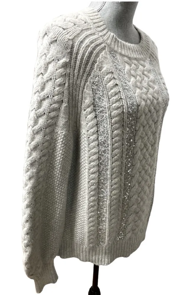 Crew Merino Wool Blend Cable Knit Sequin Pullover Sweater Sz Medium M 60% merino wool blend 40% nylo... Show more