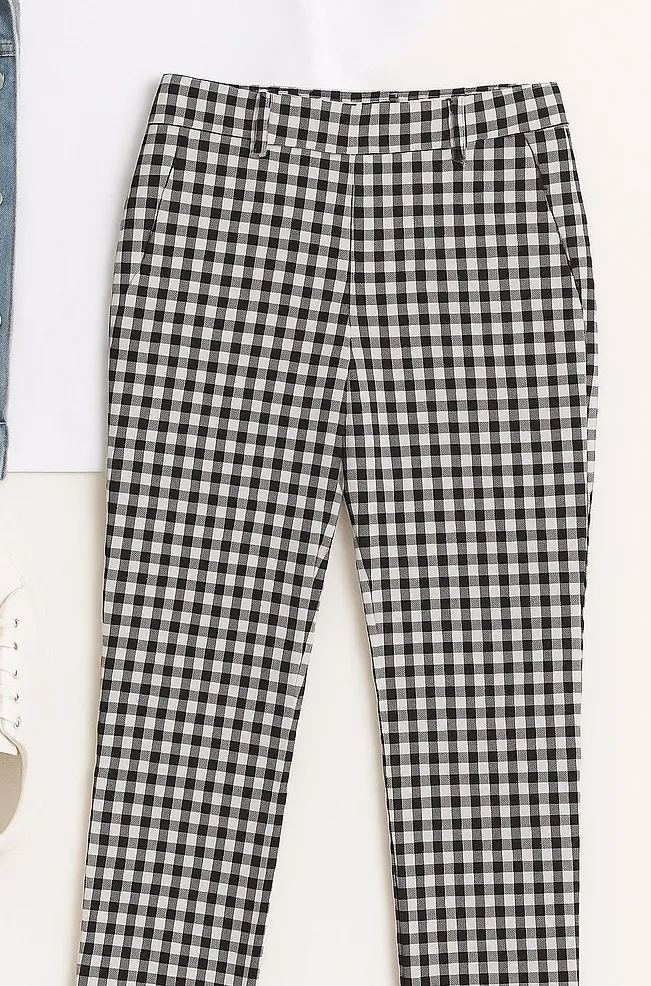 Classic black-and-white gingham in a slim ankle silhouette. Mid-rise with hook-bar/zip fly closure,... Show more