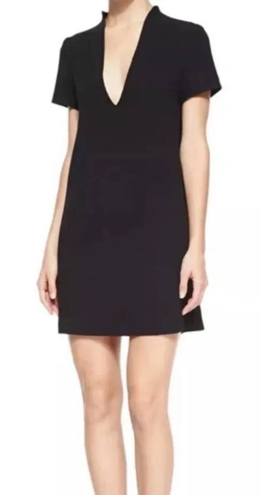 Chic black mini dress with a deep V-neck. Short sleeves and sleek silhouette. Perfect for stylish ou... Show more