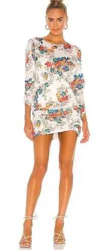 For love and lemons “Brandy” white mini dress with bold orange blue yellow red floral print. Ruched... Show more