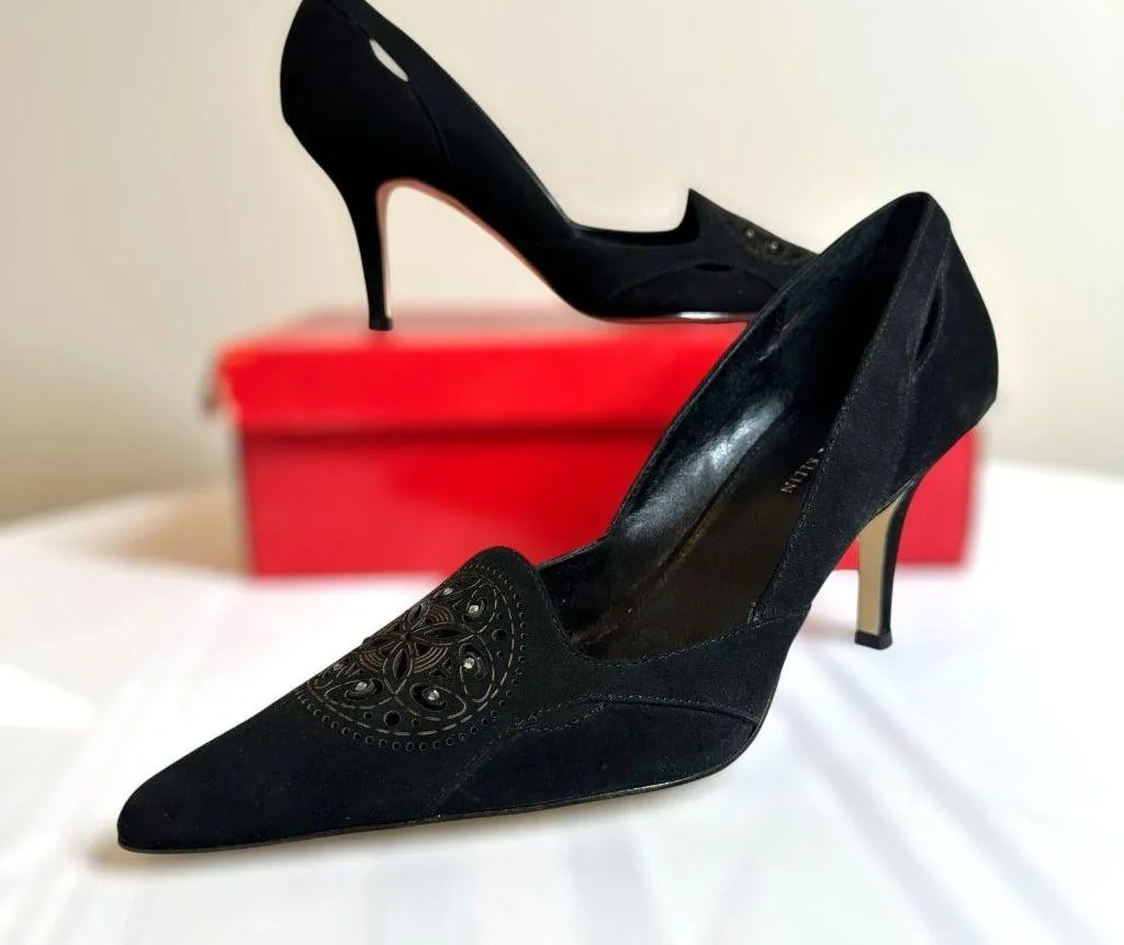 NEW AK Anne Klein Mckee Black Nubuck Crystal Accented Pointed Toe Pumps Elegant heels in b... Show more