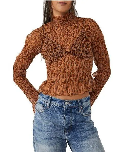 This mesh top brings retro vibes with a leopard pattern and all over smocking with shirred details a... Show more