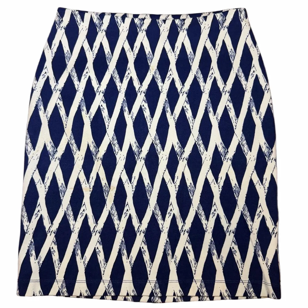 Chic pencil skirt with a striking geometric pattern. Ideal for versatile styling. Easy to dress up or down! Size 0. Some flaws throughout that I missed at first because of the busy design. May come out with extra care! SR Designer High End Luxury