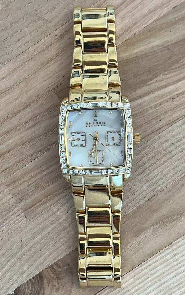 Brand: Skagen Model: N520SGXG Gender: Ladies Description: Gold-Tone Bracelet, Crystal Embellishments, Pearl Dial, Gold Tone Hands, Markers. Day Date Dials. Made in Denmark. Just cleaned, serviced with new battery installed. Works well! Condition: Excellent-Like new Band/Bracelet Type: Gold-Tone Stainless Steel Date Window?: yes, dials Power Type?: Quartz, Battery New Fresh Battery Installed?: Yes Box?: No Additional Links?: No Notes: Please see pictures for condition and measurements. Watch pillow are for photography staging only and are not included, unless otherwise stated. From a smoke free, pet free home. Condition Notes: -NWOT: New Without Tags. Brand new item. May have super light handling marks, if any. Item may have been a window display item for a short time before safe storage. -Like New: Extremely minor handling or wear marks, if any. Item may have been worn once or twice. -Excellent: Minor, but more noticeable light wear marks on band, case, and/or very light scratches on crystal, if any. -Great: Above average condition for the age of the watch. Light to moderate surface wear or scratches. -Good: Expected wear marks for typical standard use for the age of the watch. Noticeable surface scratches on band, case, and/or crystal. -Other: Will be described if applicable.