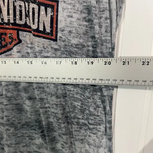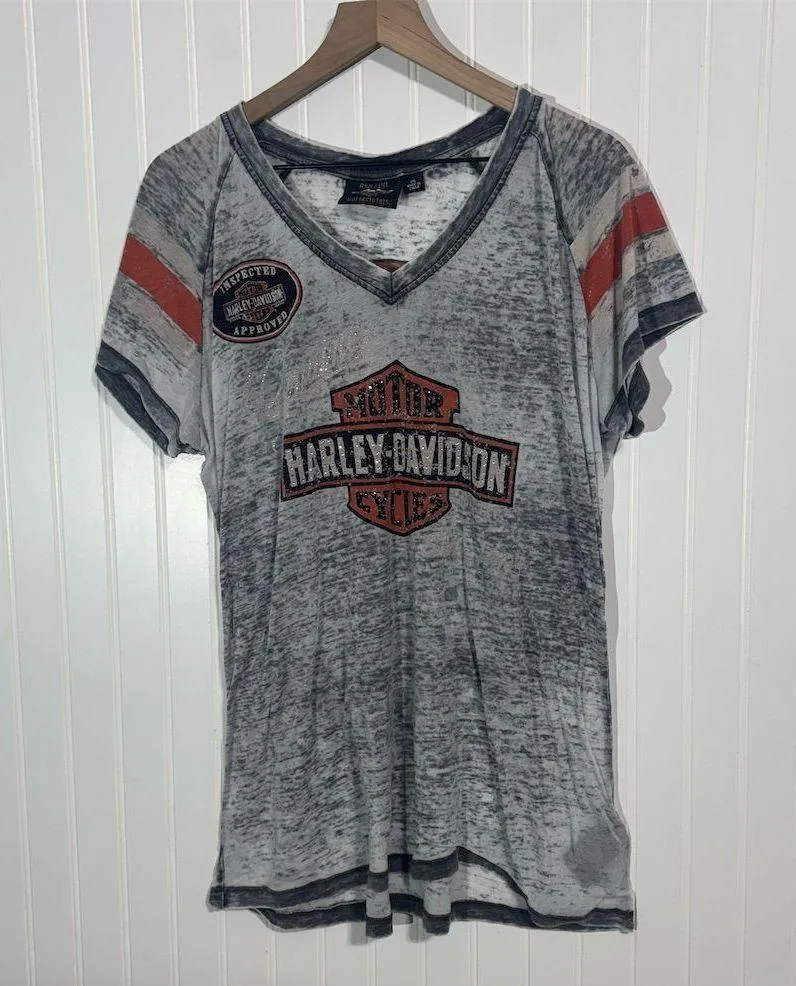 Channel your biker spirit with this women’s Harley-Davidson burnout v-neck tee. Featuring a distressed gray wash, bold Harley-Davidson Bar & Shield logo on the front and back, and sporty orange sleeve stripes, this shirt brings classic moto style with a modern, lived-in look. • Brand: Harley-Davidson Genuine MotorClothes • Color: Gray burnout wash with orange details • Style: Short sleeve v-neck graphic tee • Size: Women’s 2XL (plus size fit) • Material: 60% Cotton / 40% Polyester • Made in China • Date: 03/2021 (Style #99196-14VW) • Condition: Preowned, excellent with minimal wear. Perfect for bike nights, rallies, or everyday casual wear with jeans and boots. Harley-Davidson burnout tee, women’s motorcycle shirt, short sleeve biker tee, 2XL Harley-Davidson top, gray v-neck logo shirt, Harley-Davidson Genuine MotorClothes, moto graphic tee, vintage-style burnout shirt, distressed Harley tee, casual biker wear, riding shirt women, plus size Harley shirt, motorcycle rally apparel, retro logo tee