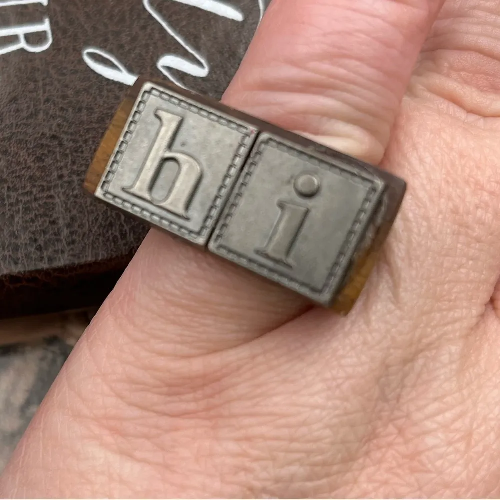 Handcrafted vintage statement ring featuring a warm wood base and metal letter tiles spelling “hi” —... Show more