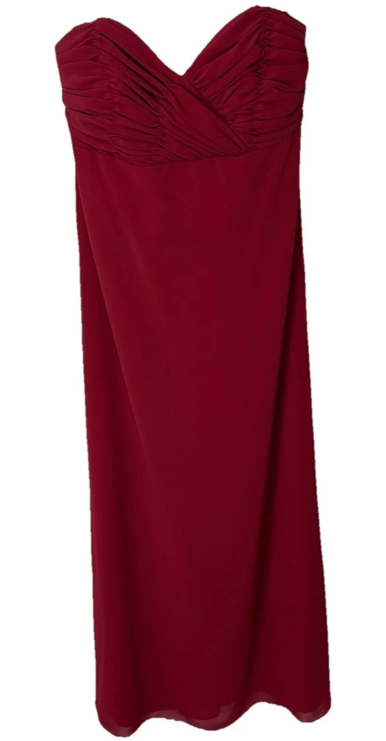 The ALFRED SUNG Size 8 Claret Strapless Sweetheart Neckline Formal Cocktail Dress is a stunning and elegant gown perfect for weddings, parties, and formal occasions. Made of polyester satin fabric, this long dress features a sleeveless design with a sweetheart neckline and a zip closure. The dress is adorned with ruched details and an empire waist, adding a touch of sophistication to the classic A-Line silhouette. With a red color and a theme of weddings and holidays, this dress is a timeless piece that can be dressed up or down for any season. Measurements (from flat lay): Pit 17" Waist 15" Hip 18" Length 47.5" Boning at bust for structure
