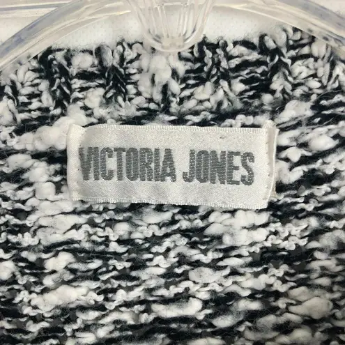 Victoria Jones pullover sweater in black, gray, white, and pink. Mock neck. Drop shoulders. 3/4 sleeves. Ribbed neck and hem. Heavy and chunky knit. Dress it up or down. In good used condition. No stains, tears or holes. No material tag. Acrylic feel. No size tag but according to measurements should fit a relaxed size medium. vintage retro style fashion feminine office workwear business casual artsy art to wear