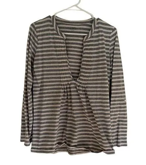A gray and white striped long sleeved v-neck blouse. Made of 100% cotton. Labeled a women's size med... Show more