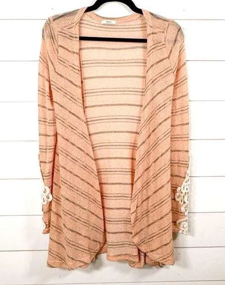 Jodifl Women's Rayon Blend Open Front Stripe Cardigan Sweater Pink Creme Size Small Brand: Jodifl Department: Women's Color: Pink Cream Size: Small Type: Sweater Style: Cardigan Sleeve Length: Long Sleeve Closure: Open Pattern: Striped Material: 59% Polyester, 39% Rayon, 2% Spandex Condition: Excellent Condition Features - Lightweight - Open front - Pink with drarker stripes - Fitted bodice and flounce hem - Cream lace accents at the bottom of each sleeve - Hand wash Bohemian, Contemporary, Feminine, Casual, Boho