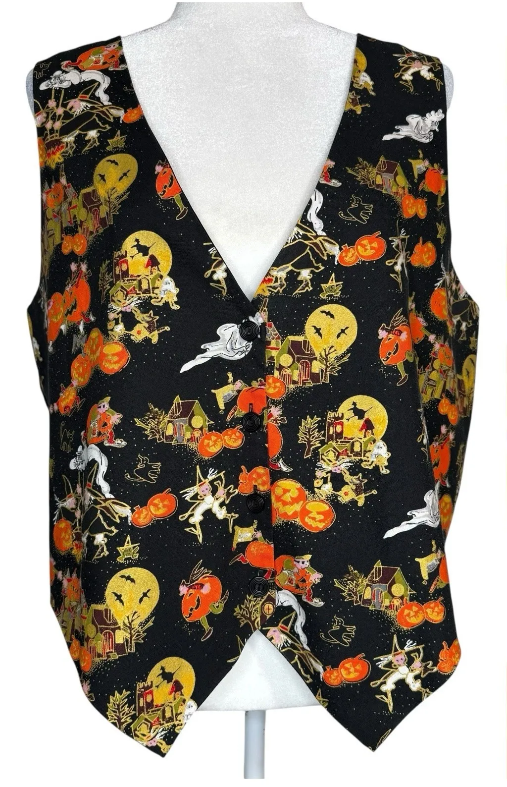 Spooky, fun, and full of 90s charm — this vintage Basic Editions Halloween vest is the perfect festive piece for collectors, parties, or themed outfits! Made from a soft woven fabric, this sleeveless vest features a whimsical Halloween print with witches, jack-o'-lanterns, ghosts, frogs, bats, and haunted houses all under a glowing golden moon. The vibrant orange, yellow, and gold tones pop beautifully against the black background. Designed with front button closure, a V-neckline, pointed hem, and a sleek black satin back with adjustable tie, it's a classic statement piece that can be dressed up or worn casually for that perfectly kitschy seasonal look. Details: Brand: Basic Editions Era: 1990s Size: XL (see photos for measurements) Color: Black with orange, yellow, white, and gold accents Style: Button-front sleeveless vest Pattern: Allover Halloween print — witches, pumpkins, frogs, bats, and full moons Material: Likely polyester blend (tagged machine washable) Condition: Excellent vintage condition — minimal signs of wear, no major flaws Perfect for Halloween enthusiasts, teachers, performers, or collectors of nostalgic 90s novelty apparel. Ships within 24 hours Keywords: vintage Halloween vest, 90s Halloween clothing, witch print vest, pumpkin jack o lantern vest, spooky costume top, Basic Editions vest, gothic cottagecore, kitschy holiday apparel, haunted house print, retro Halloween outfit, unisex costume vest, ghost print top, Halloween novelty clothing