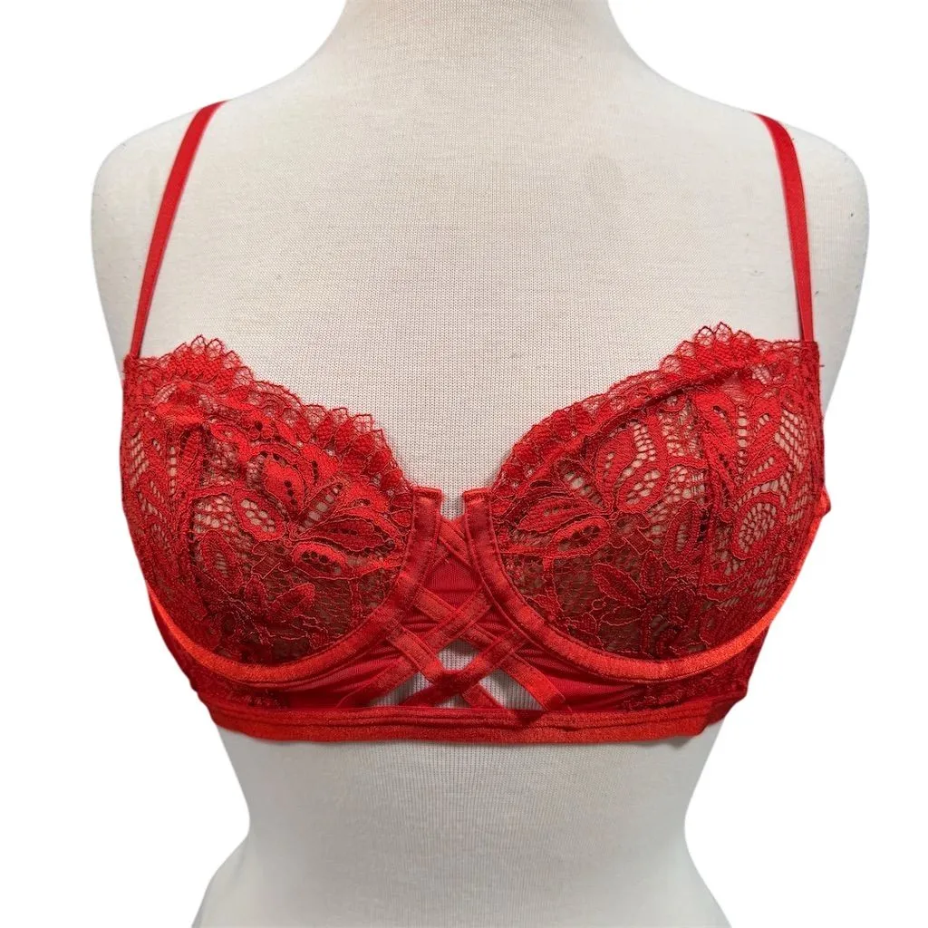 The Adore Me Balconette Bra in size 34C features a red lace overlay with intricate patterns and supp... Show more