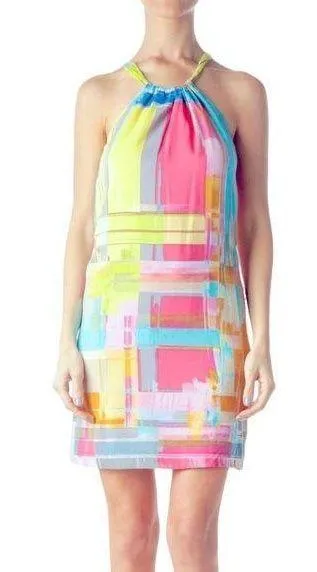 TRINA TURK SILK HALTER MULTI COLORED PINK BLUE SHIFT LINED SUN DRESS Size 6 Ptp approx 18 inches A... Show more