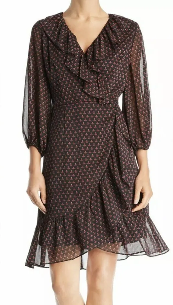 Chic long sleeve dress with a delicate red pattern. Features a ruffled neckline and elegant fit. Per... Show more