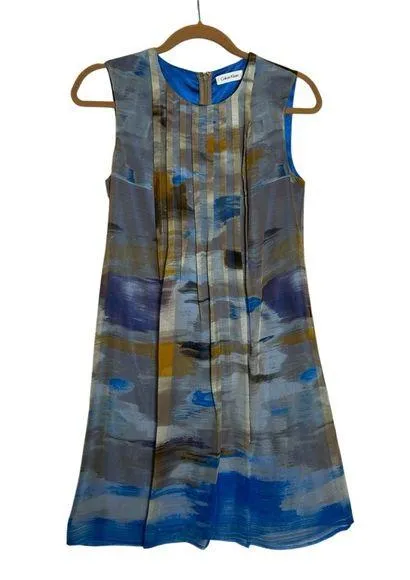 Calvin Klein 100% Silk Blue Tan Abstract Watercolor Sleeveless Pleated Dress Size 2 Measurements... Show more