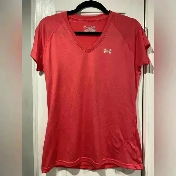 Under Armor Women’s size small Excellent condition Semi fitted short sleeve stretchy Heat gear Pink... Show more