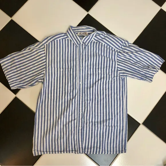 Short sleeve blue & white striped button down shirt 2 breast pockets Vintage 80s-early 90s shirt in... Show more