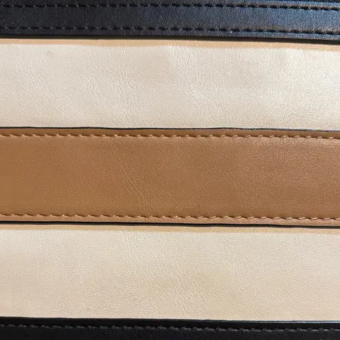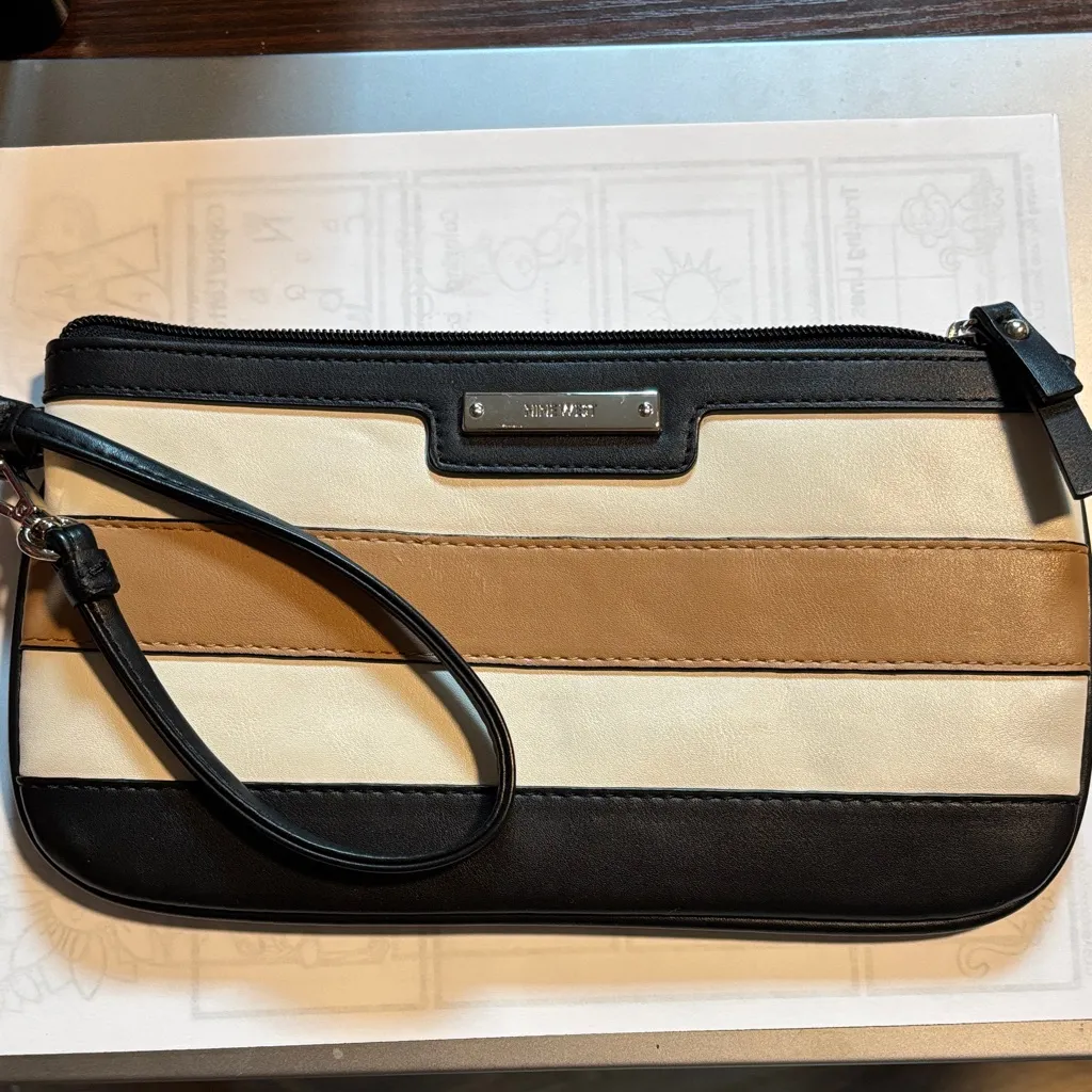Elegant Nine West clutch with a sleek black, cream, and tan stripes. Clean, striped interior with... Show more