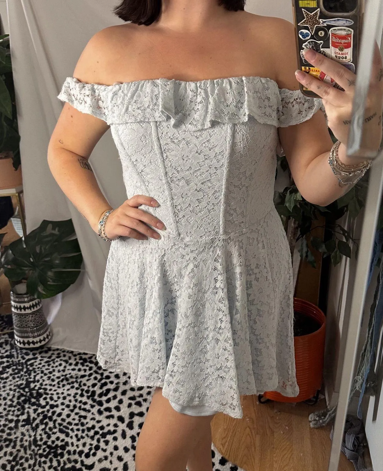 Urban Outfitters Kimchi Blue Lilly Dress pale light Blue Large Lace fabric Off the shoulder Boning o... Show more
