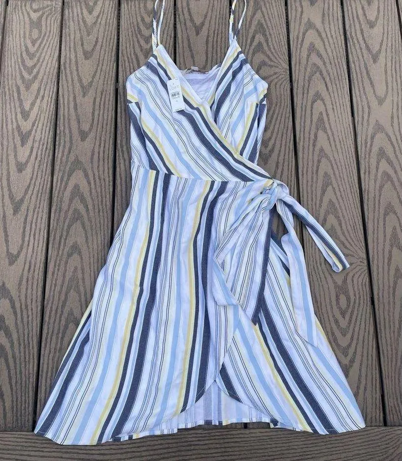 NWT Loft Wrap Dress with tie waist Size 6 White with blue and yellow stripes Sleeveless Adjustable... Show more