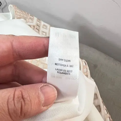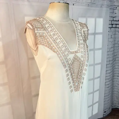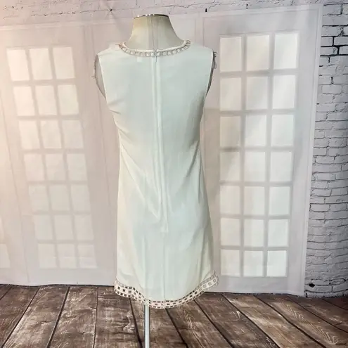 This versatile piece is a must-have for your warm weather wardrobe, with its airy silhouette and delicate embroidery. The soft ivory white color is perfect for showing off your sun-kissed skin, while the sleeveless design keeps you feeling cool and breezy. Whether you're attending a garden party or exploring a new city, this dress will be your go-to choice for effortless elegance. Just slip it on, add your favorite accessories, and you're ready to take on the day with grace and style. Brand: Ella Moss Department: Women's Size: XS Color: Ivory White Style: Shift Dress Closure: Zip, Hook & Eye Neckline: V-Neck Sleeve Length: Sleeveless Pattern: Aztec/Solid Material: Self - 100% Silk, Contrast - 100% Polyester Condition: Pre-Owned Features: - 1 Above Knee Length - 2 Embroidered - 3 Concealed Back Zipper Closure - 4 Lined - 5 Dry Clean Approximate Measurements (Lay Flat): Pit to Pit: 17" Waist: 15.5" Hips: 19" Length: 36"