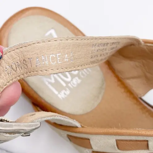Miz Mooz Constance Leather Backstrap Heeled Sandals Color: Linen (tan and ivory) How low can you go? This European leather sandal features a low, comfortable heel suited to crosstown treks, yet still feels elevated thanks to a striking woven design and impeccable Miz Mooz craftsmanship. Sport them to the office, happy hour, and your dinner date -- and give your higher heels the day off! Style: Constance European leather upper, woven detail, adjustable backstrap with buckle closure Padded footbed Approximate measurements: Sole 1/4"H; Heel 1-3/4"H Fit: true to size Leather upper/lining; man-made outsole EU Size 42 / US Size 10.5 - 11 Excellent condition Hardly worn; see photos