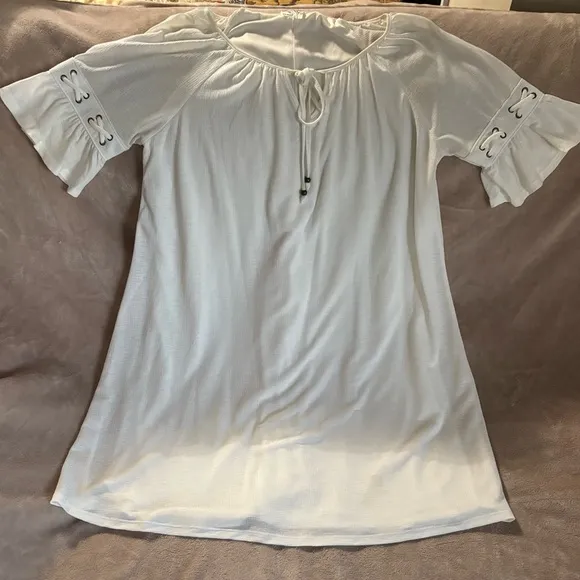 This relaxed white dress from NAIF features short designed bell sleeves and a charming tie front. Its flowing silhouette and soft fabric make it perfect for a casual, bohemian look on a summer day. A little below knee true to size Women’s XL stretchy in great condition