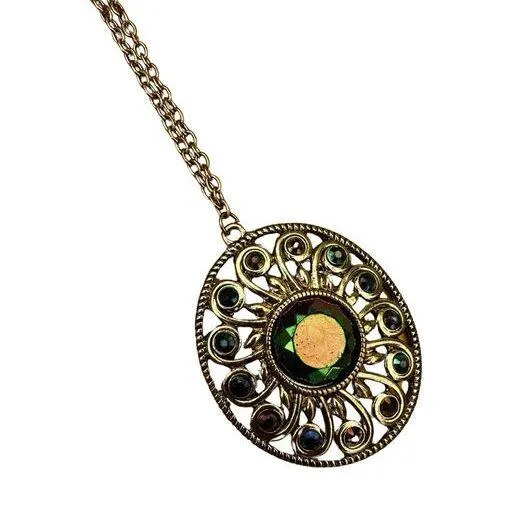 Gorgeous renaissance style pendant necklace. The pendant is oval shaped with curlicues that spiral out from a larger center rhinestone. Each rhinestone is glass and reflects in purples, blues and greens - very peacock style colors. The chain and the pendant are an aged gold color. The bigger rhinestone does have some scratches and little flea bites frome wear, but otherwise good vintage condition. Would be great for cosplay for a Renfest, fairy, regency, Bridgerton, Game of Thrones or Lord of the Rings style costume. Measures 32" long with a 2 1/4" x 2" pendant.