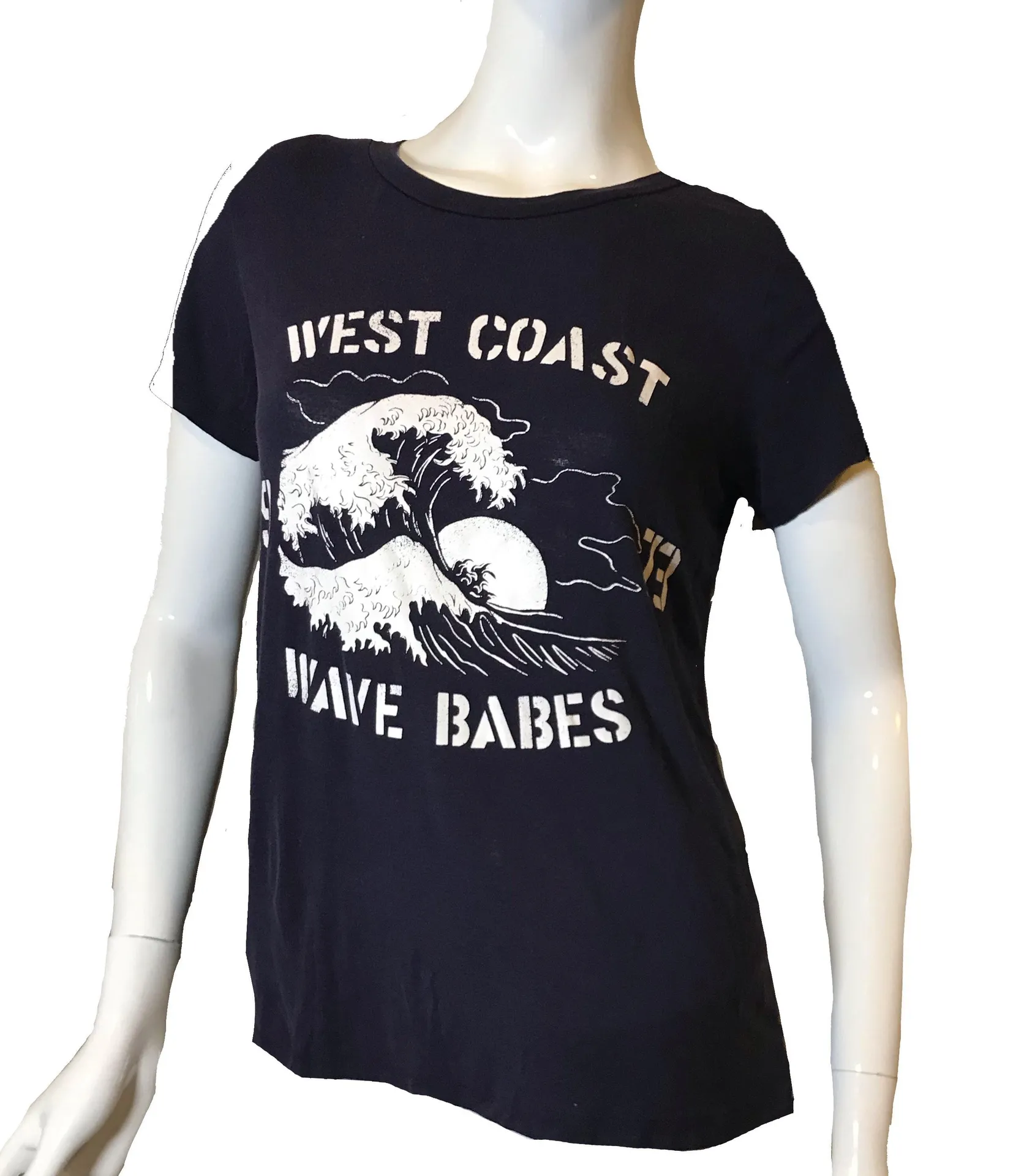Navy and white graphic tee has a Ancient woodblock wave design with the words “West Coast Wave Babes... Show more