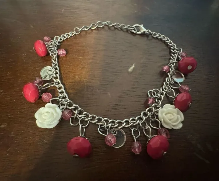 Vintage Y2K Womens Pink Floral Rose Rhinestone Chain Beaded Charm Bracelet 90s Great Preowned Condition!! Bundle and Save!! Feminine Romantic Dainty Boho Preppy Girly Delicate Pretty 90's Y2K Vintage