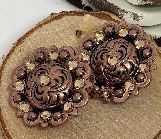 Copper engraved metal post earrings with topaz Swarovski crystals. Lightweight - $13 - From Kim