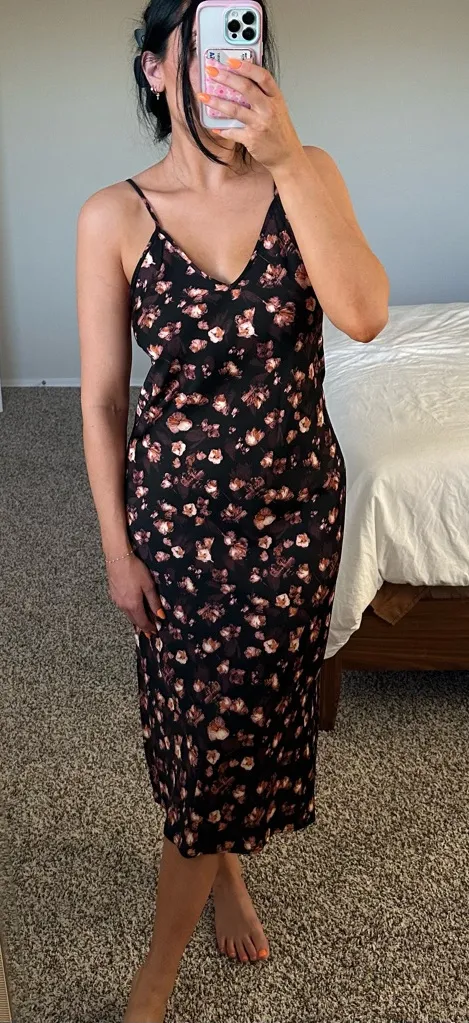 Black pink purple orange Printed dress spaghetti straps V neck Silky Side slit Midi Li... Show more