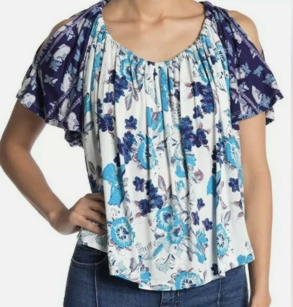 Brand new with tags NWT Free People Baja Babe Cold Shoulder Top Blue & Ivory Boho Women’s Small S. F... Show more