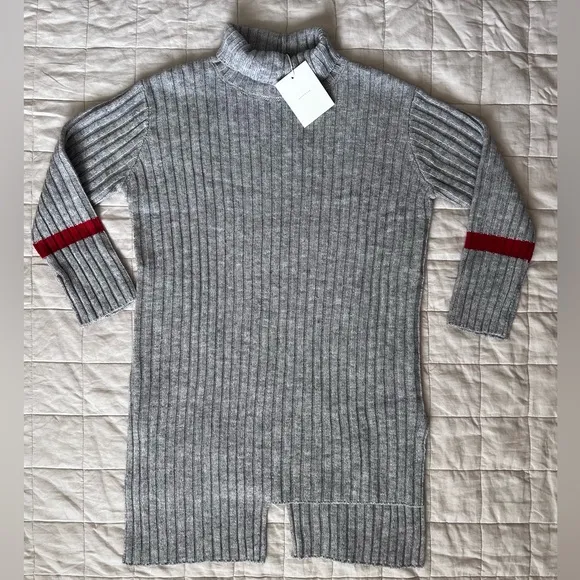 Neiman Marcus Avantlook Artsy Unique Grey Chunky Rib Knit Turtleneck Asymmetrical Cut Mini Dress / Tunic - Small New, no flaws Features Turtleneck with split detail on back of neck Long sleeves with red stripe & split cuffs Squared asymmetrical cut outs Measurements & fabric details in photos Tags Contemporary Unique Holiday Fall Winter Cozy Cabin