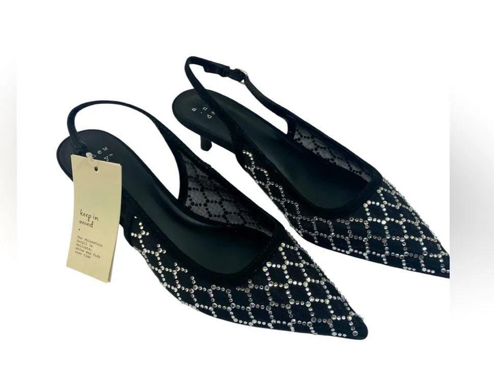 Elegant black mesh slingback heels with sparkling rhinestone lattice detail. Chic pointed toe with a... Show more
