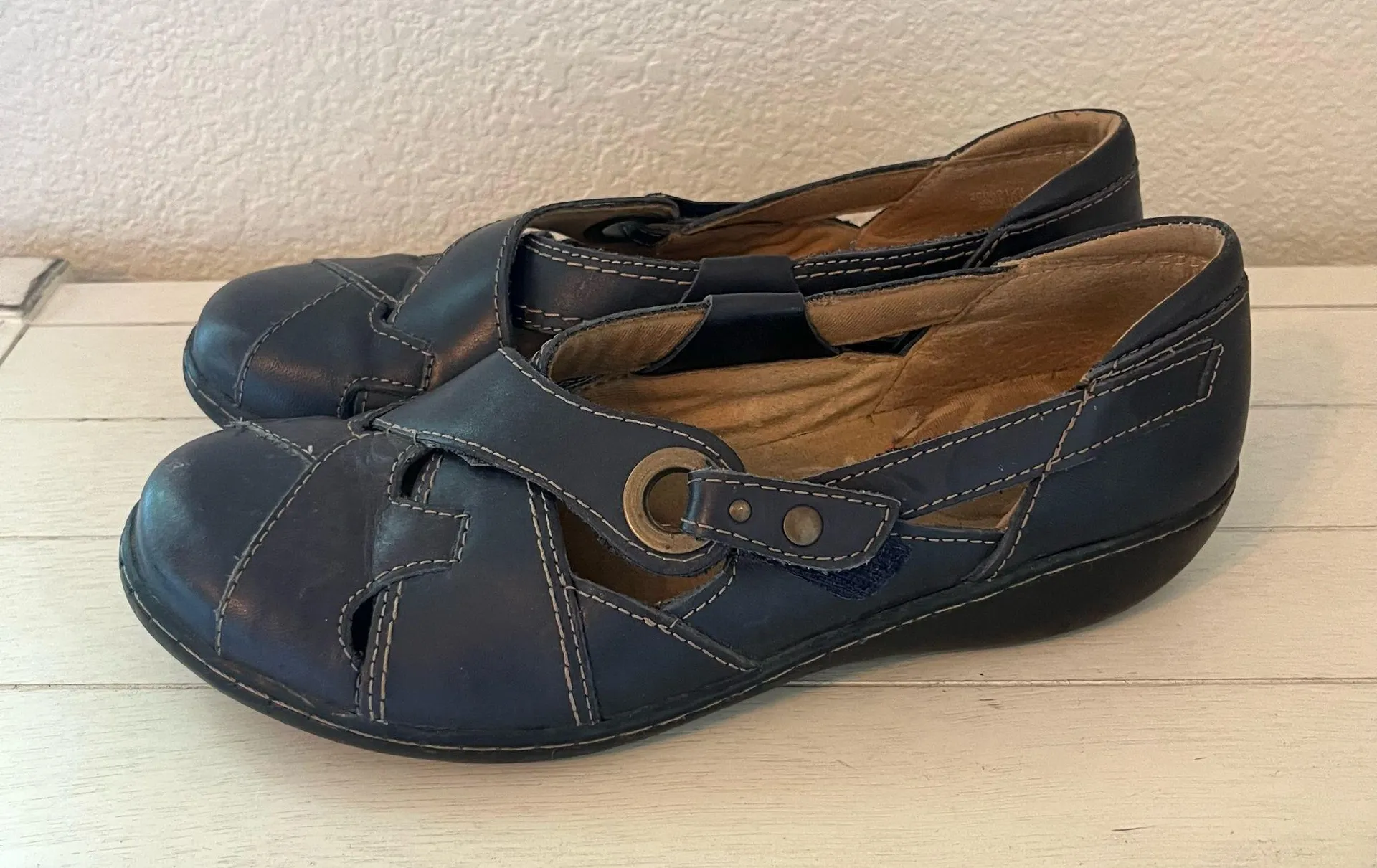 Clarks Navy Blue Leather Slip On Shoes Flats Loafers. Velcro strap. Round toe. Size 8.5 There is so... Show more