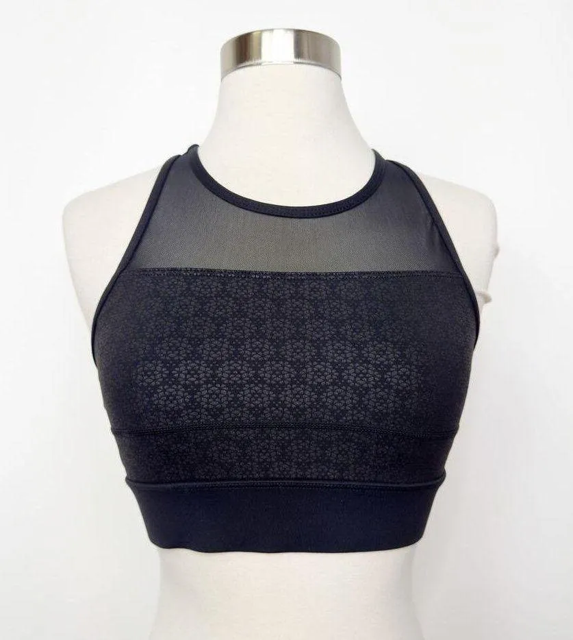 ZYIA Black Flower All Star Sports Bra in women's size small. This All Star bra has a high fit scooped neckline with ventilated mesh in front and back. Cute flower detail throughout. Zipper closure in back with an easy-pull tab. High support and good coverage for intense workouts. Removable cups (not included). Excellent pre-owned condition.