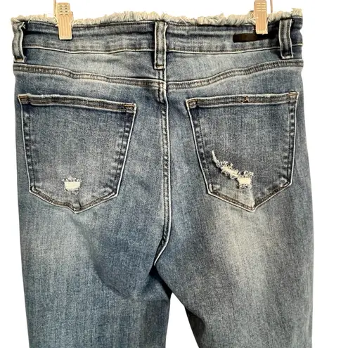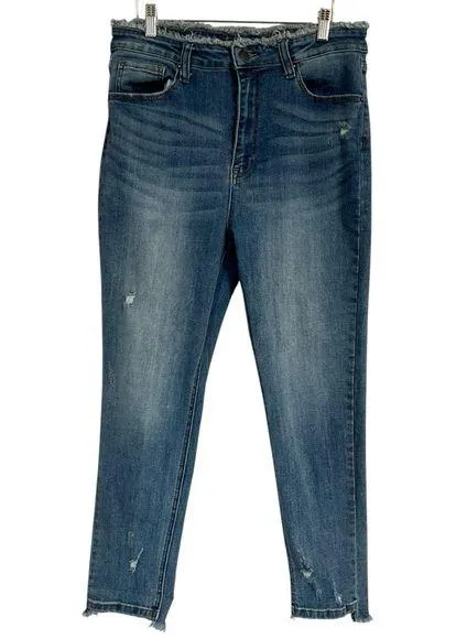 Risen 1262 frayed raw edge waist hemline. The frayed waist line and the combined cut hem give the perfect fun jean. These jeans are in a medium wash denim with slight distressing and great stretch.