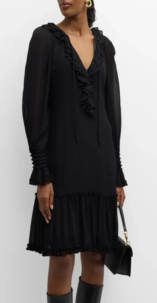 Kobi Halperin "Collin" crinkled midi dress with ruffle trim V neckline; front self-tie Long raglan... Show more