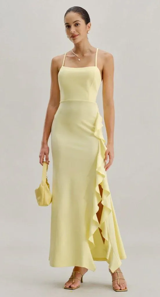 Occasion: special occasion - Style: Formal - Back Neckline: Corset - Fabric Stretch: Medium Stretch - Waist: Natural Waisted - Sleeve Length: Sleeveless - Sleeve Type: Sleeveless - Embellishment: Backless, Slit, Tie, Ruffle - Neckline: Spaghetti Strap - Dress Type: Slip - Silhouette: Trumpet - Fabric: Polyester