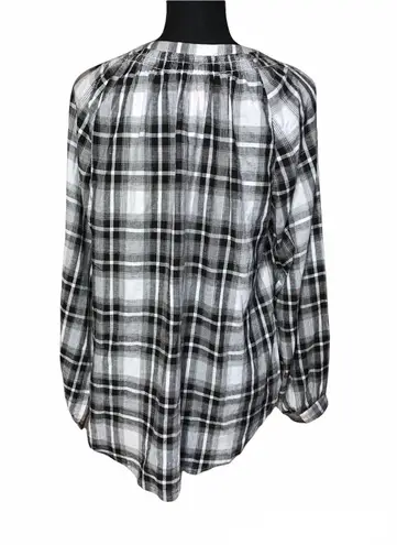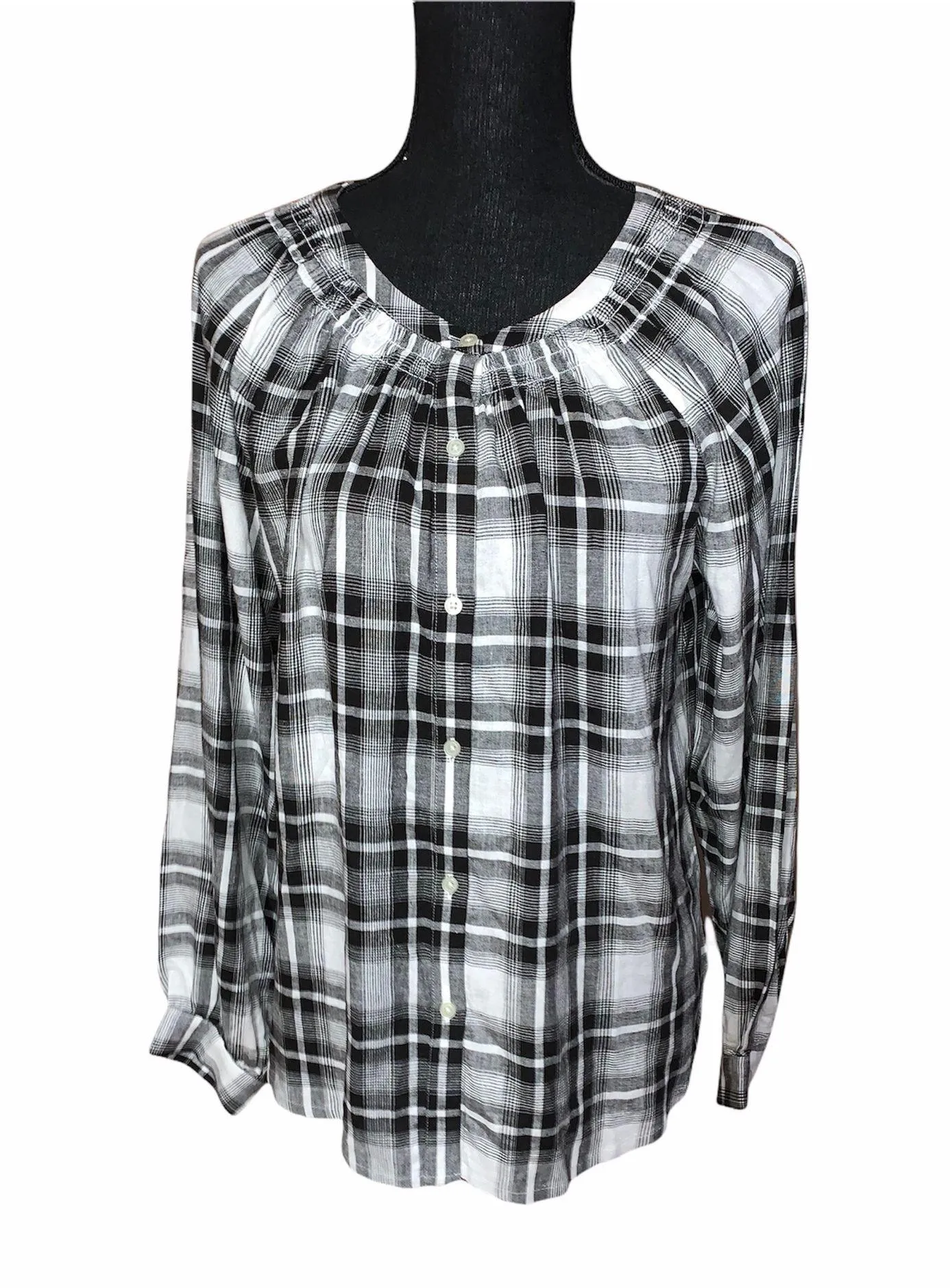 Black and white plaid button front blouse. Long sleeve with button cuff. Collarless. Side hem slits.... Show more