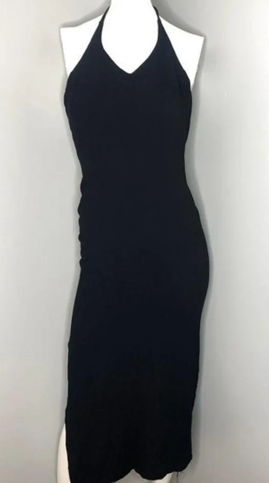 Club Monaco collection solid black halter neck dress hidden zip back side slit cocktail dress V-nec... Show more