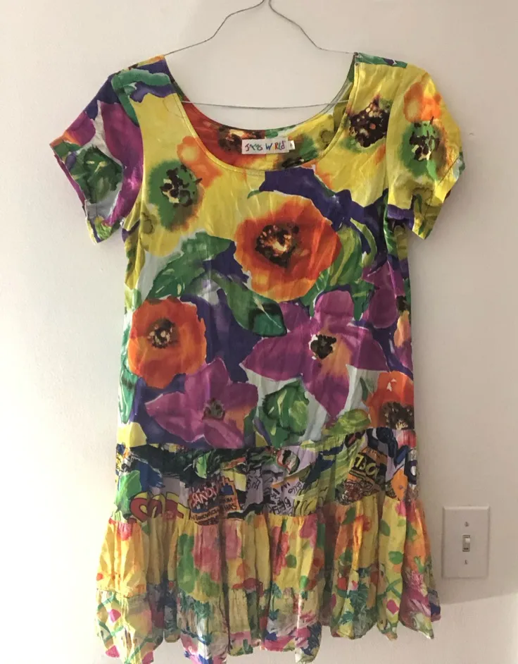 Excellent condition No noted flaws Color is multicolor floral print poppy print and mixed print Size small 100% rayon composition Short sleeve tiered mini dress Dress is NOT lined Colorful floral vintage designer Hawaiian tropical travel beach bohemian boho resort wear holiday Our classic, so very comfortable style. Deep u-neckline Drop-waist body Three tiers of ruffles 100% Spun Crush Printed Rayon
