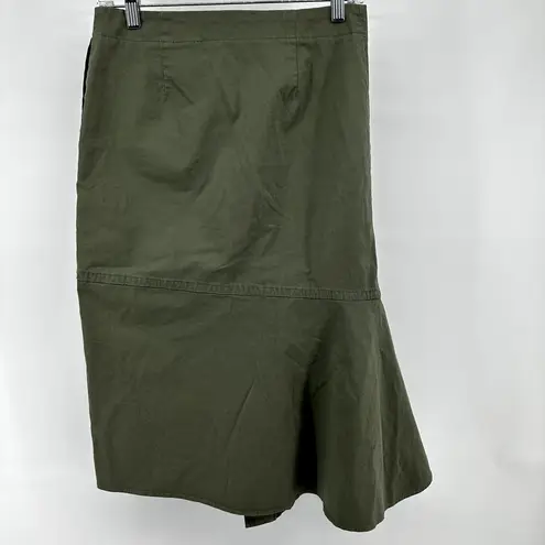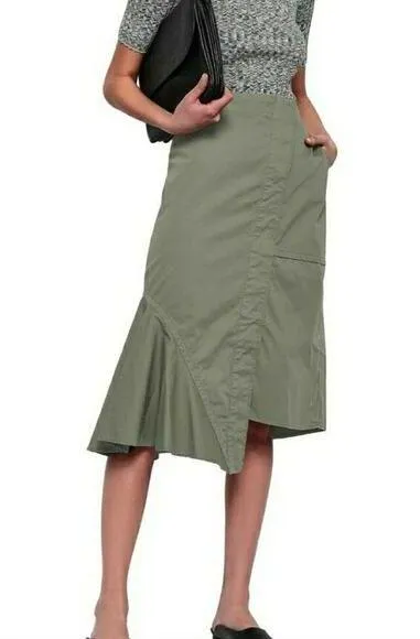 A-line silhouette. Exposed seams. Midi length. Good Stretch to it. Pocket on side left side. Asymmet... Show more